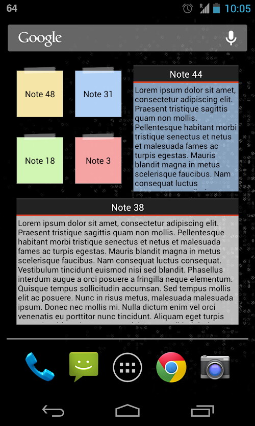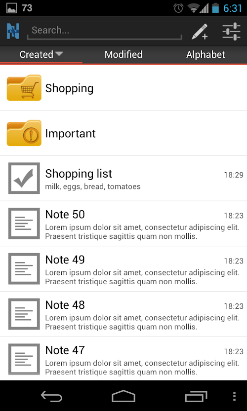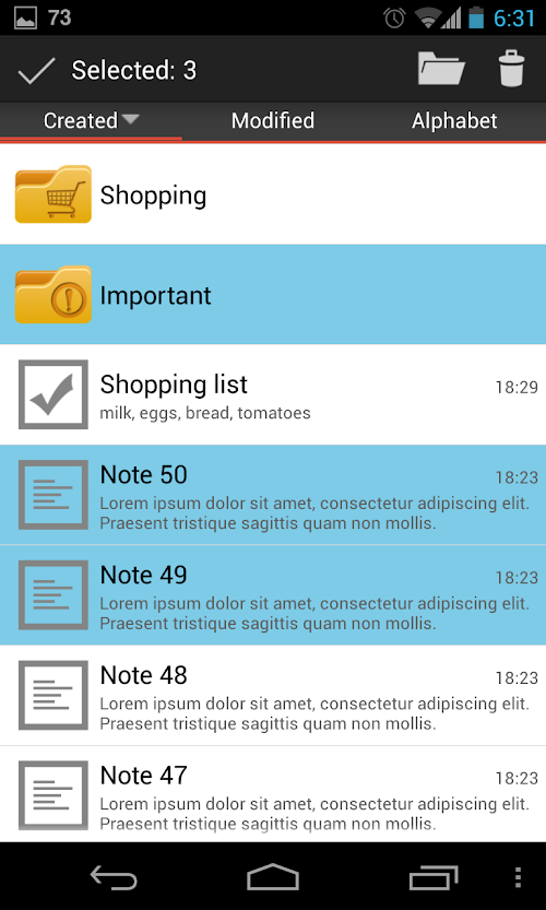 Elegant notepad application with nice animations and useful functions. Fast scrolling between notes, grouping notes in folders, notifications, to-do lists, delete multiple items at once, password protection, export/import, real time search function, 1x1 and 2x2 app widgets and many more! More features coming soon!