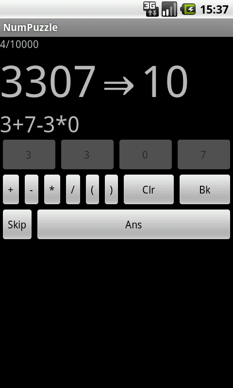 NumPuzzle is a kind of puzzle game that's similar to a famous puzzle called "Ten Puzzle" or "Make 10" or "Make 24". The goal is to make a specific number by using addition, subtraction, multiplication, and division process for four numbers. For example, if a question is "1234->10", the specific number is ten and four numbers are 1,2,3 and 4. Therefore one of the answer is "1+2+3+4" (because 1+2+3+4=10). Also "2*3+4*1" or "2*4+3-1" can be the answer. The NumPuzzle has 10,000 different questions and each of them certainly has an answer.