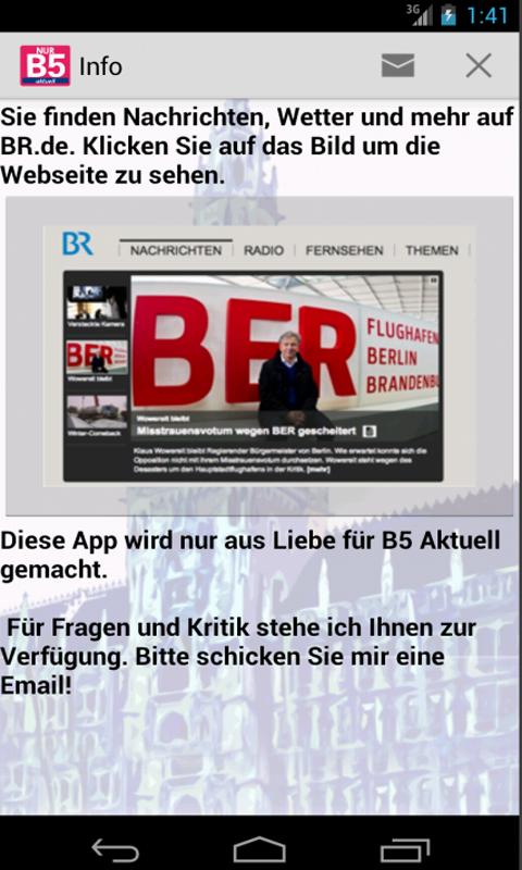 Diese App wird nur aus Liebe für B5 Aktuell gemacht -- ich verdiene gar kein Geld daran. Für Fragen und Kritik stehe ich Ihnen zur Verfügung. Bitte schicken Sie mir eine Email!