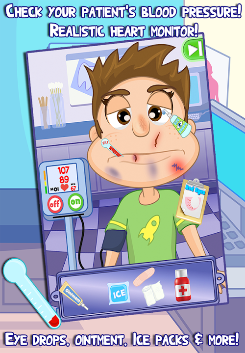 Clean the patient's wounds with ointment, bandage them up, take their Blood Pressure and Vital Signs, and see their injuries disappear!
