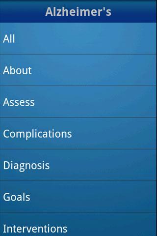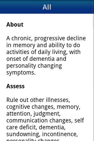 This application allows novice nurses and nursing students to search for over 340 common diseases and disorders, separated by body system. Once the disease/ disorder is selected, the user will be able to have useful information right at their fingertips, including a nursing process approach to managing client care. There are simple explanations of what each of the diseases/ disorders are and common assessment findings associated with them. In addition, useful information is included that incorporates priority assessments needed for clients with the selected disease/ disorder. Potential applicable Nursing Diagnoses with related factors and client goals are also incorporated. Appropriate interventions are outlined to help guide client care and encourage a comprehensive approach to managing client care. These can be especially useful when studying for NCLEX examinations, developing client-centered care plans, and in acute care medical-surgical settings. Finally, the nursing process would not be complete without an evaluation. Complications are outlined for each disease/ disorder to help student nurses and novice nurses start to build upon foundations presented through core nursing education classes.