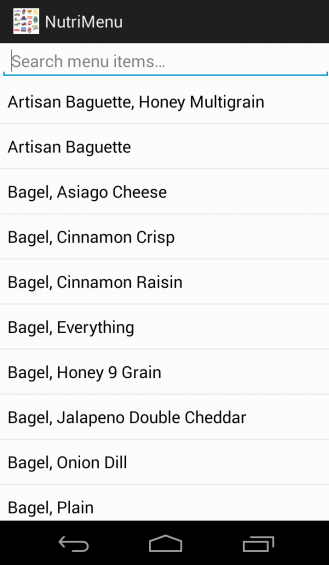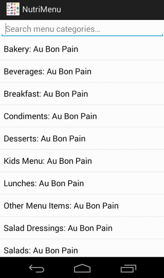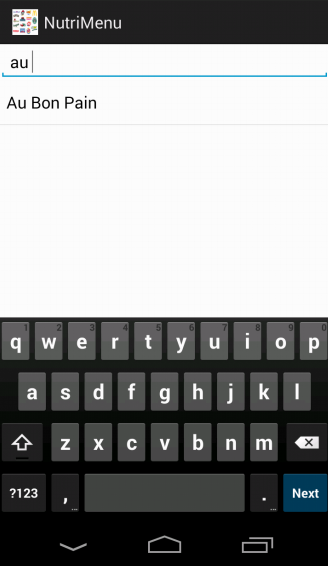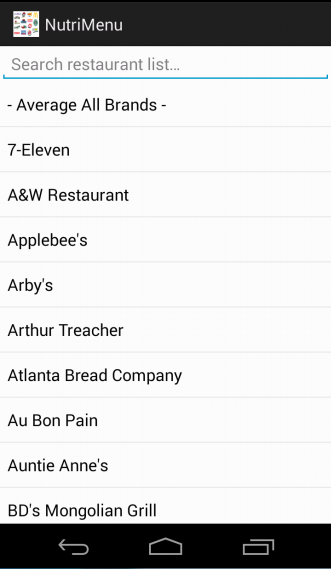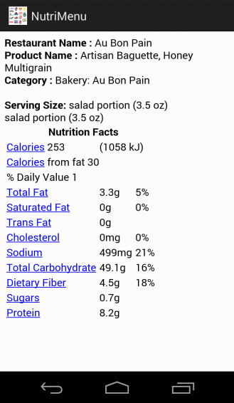 NutriMenu is an Android application that allows the user to get nutritional information on menu items from 296 restaurant chains (e.g., A&W, Applebee's, Arby's, Au Bon Pain, etc.). The user selects a restaurant, a menu category and an individual menu item in that cateogry. After an item is chosen, its nutrtional information is displayed with embedded Wikipedia links to important nutrition terms