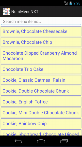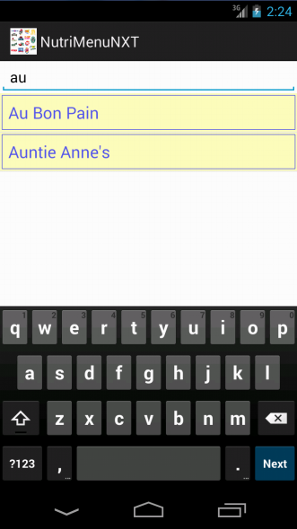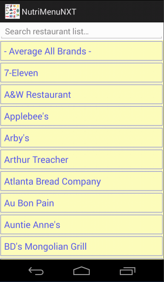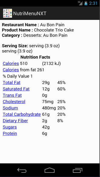 NutriMenuNXT is a slightly improved version of NutriMenu. It is an Android application that allows the user to get nutritional information on menu items from 296 restaurant chains (e.g., A&W, Applebee's, Arby's, Au Bon Pain, etc.). The user selects a restaurant, a menu category and an individual menu item in that cateogry. After an item is chosen, its nutrtional information is displayed with embedded Wikipedia links to important nutrition terms. The differences between NutriMenuNXT and NutriMenu are: