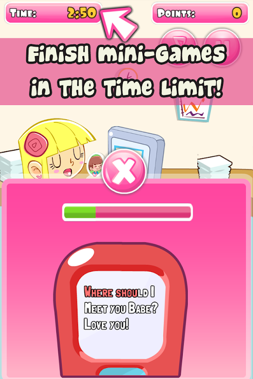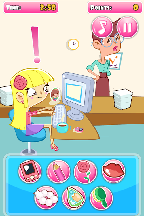 Sarah has a romantic date planned for this evening and she can't wait to escape work to meet up with her hunky boyfriend, Tim. But she's stuck in the office and counting down the seconds until she can leave... Can she pass the time and have a bit of fun slacking in the office instead? Help Sarah prepare for her date without her boss noticing in this fun date slacking skill game!