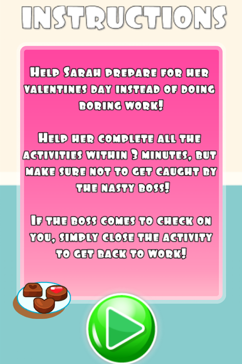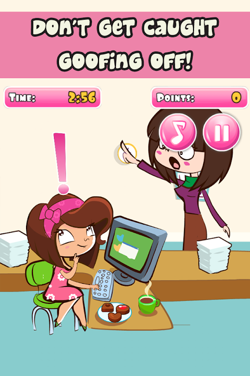 It's Valentine's Day and Sarah wants to prepare for a romantic date with her boyfriend after work. But office work is dull work, and Sarah is bored of paperwork and typing up reports. Help Sarah get ready for Valentine's by avoiding her boss and exchanging work for fun, Facebook status updates and quick make up sessions. Can you become an expert slacker in this fun skill game?