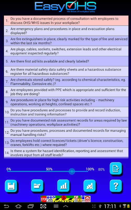 It is the perfect companion for Safety Consultants who are visiting potential clients to quickly establish the current safety level in those workplaces and the colourful graph makes it easy to explain why your services might be needed.