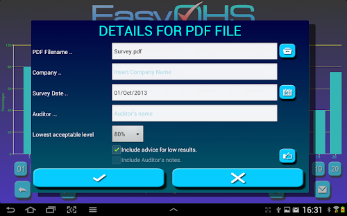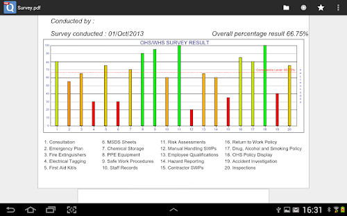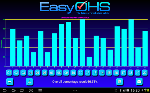This is the FREE version which allows you to produce a colourful graph of the results of the survey and attach built-in advice for each area surveyed. That is all produced as a PDF file which can be emailed direct from the application to the person responsible for the Occupational Health and Safety in the company.