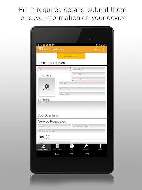 Sales and Service Order allows taking an oil or gas sales or service orders. Basic information is tracked with account and invoice numbers, along with a job overview, tank and appliances details, specific job information, parts used (quantity/price), and all calculated totals. All calculations are also done automatically in the application, rather than manually using pencil and a calculator.