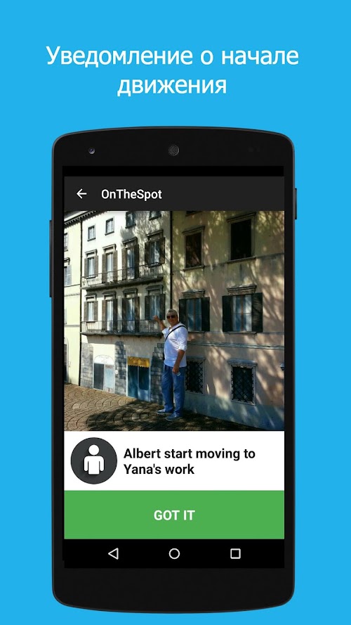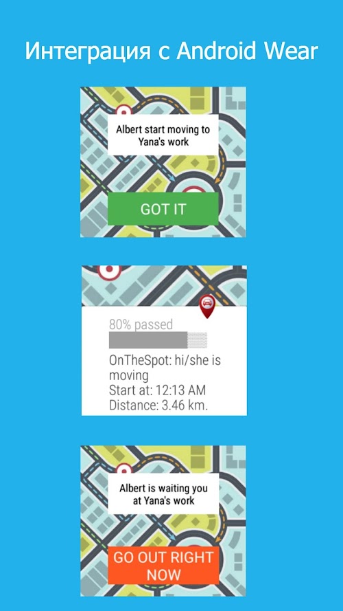 as soon as you set up the timer, the contact person receives a notification that you are moving toward him; also, once every 10 minutes, he receives your actual coordinates – that way, you don’t need to inform him of problems along the way (traffic jams, accidents, etc.)