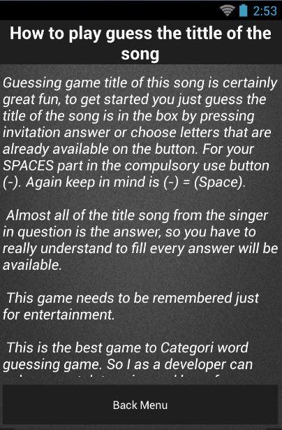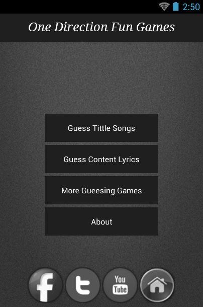 This One Direction Guessing Game is a guessing game to guess the title of the song and the lyrics. It's nice if you can win every level, because the game is made very simple so easy to understand displays. By the time you start the game you will certainly show the initial face a very simple but very elegant. In every game has been made by Categori already set so that you can choose between two games in one application.