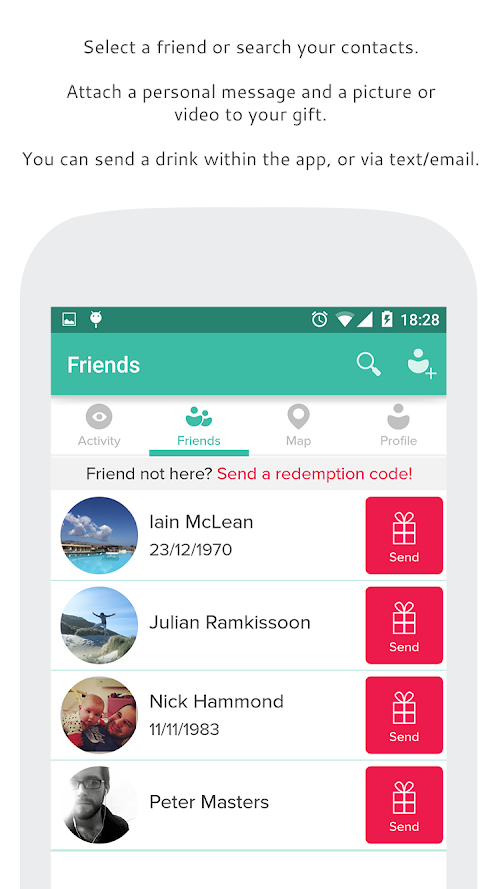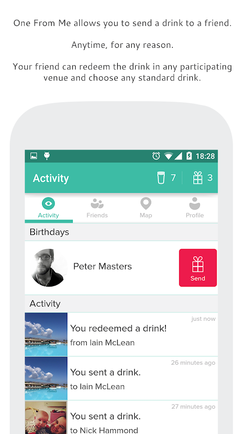 Download One From Me to see your friends who already have the app, easily gift drinks and redeem any drinks you receive. The app is free to download and we hope you love it. Invite your friends, and let's start a gifting renaissance!