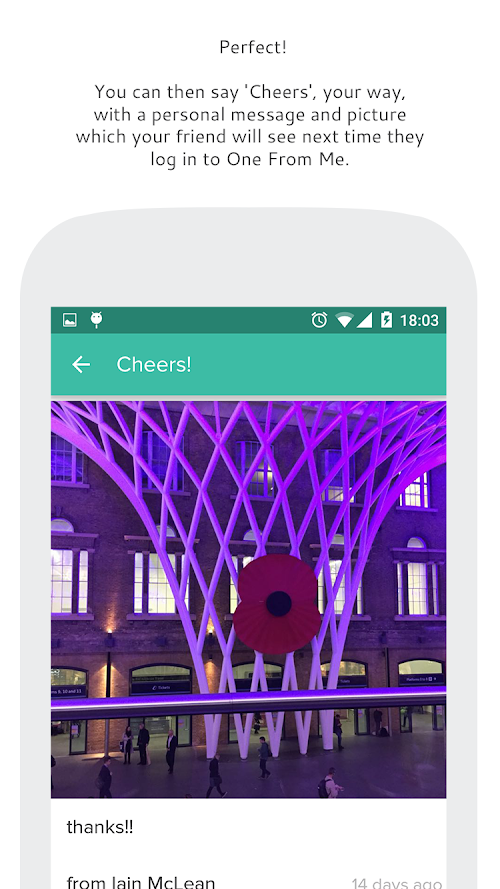 The gift of a drink is the easiest way to say 'thank you', 'happy birthday', 'well done' or just 'wish you were here'. One From Me allows you to do this instantly whenever you feel like it from anywhere.