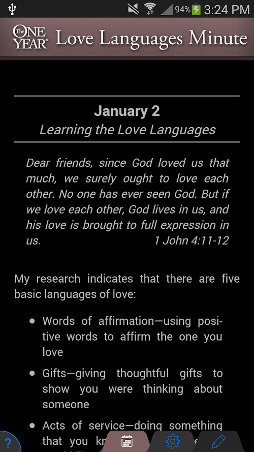 Do-able. Daily. Devotions. Start any day The One Year way. Spend this year growing closer to those you love the most. Let Dr. Gary Chapman be your daily guide to expressing your love in ways your loved ones can receive it.