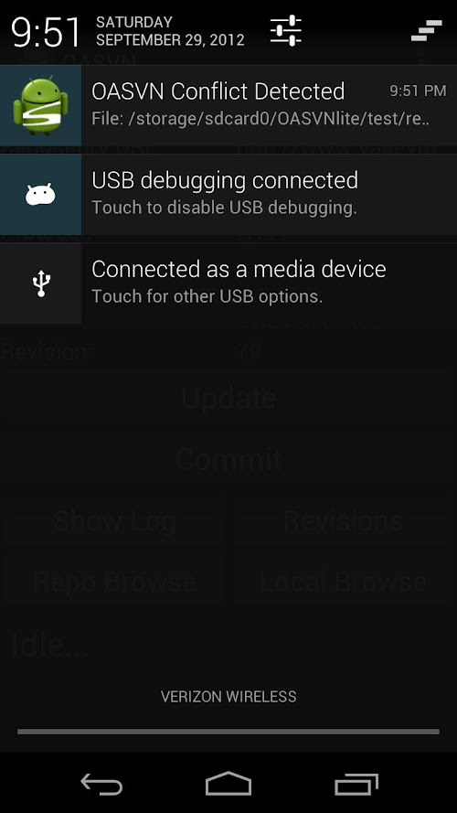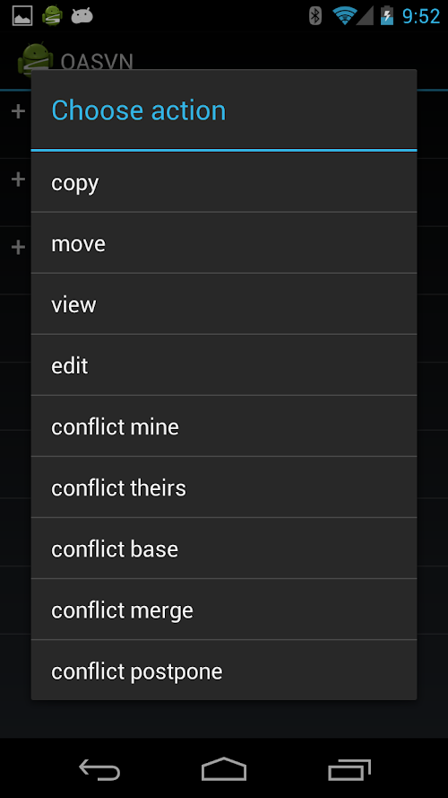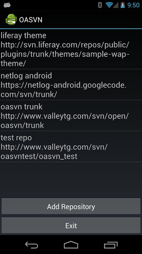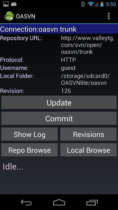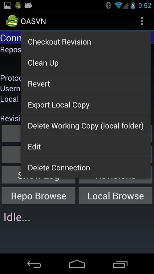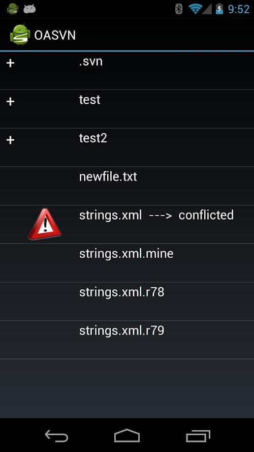 • Local Repository browsing allows you to export from your local copy, open files via intent by mime type (should present your with the correct application choices for the job, it is up to the application to respect opening the file by URI) and also shows svn status of files in conflict, or locally updated.