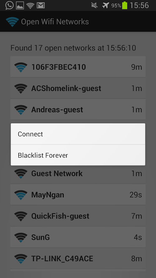 The "Open Wifi Finder" is a simple activity that displays open wifi networks that your device can connect to. It is a copy of the android wifi network connection dialog with several differences. It displays only open networks which is useful when you need free internet connectivity while on the go. Sometimes networks that haven't broadcasted recently disappear and reappear. Sometimes there are a zillion networks in the wifi connect list. Finding and connecting to an open network in a highly fluid and huge list makes connection difficult. This activity attempts to keep the list small and more manageable. There are usually a lot of open networks that are not open and require a username and password. This activity allows you to blacklist networks that you never want to connect to. This activity is useful when all you want to is open wifi networks quickly and efficiently.