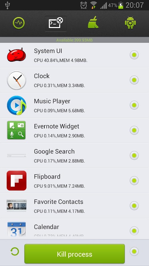 Close idle app processes with a single tap and take back the processing power they're consuming so your phone is exclusively focused on the apps you want to run! You'll notice the difference right away on the handy CPU meter display. If there are processes you never want to close in Optimize Master, simply long-press them and choose "Protect from stopping".