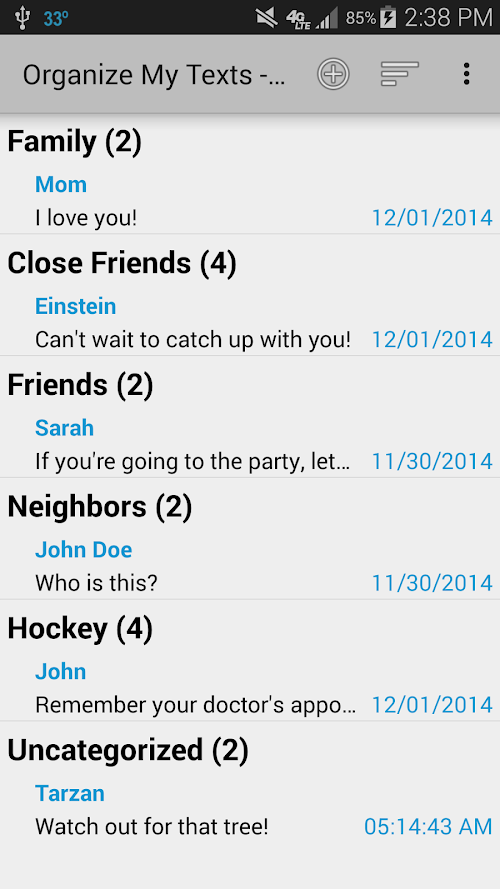 Organize My Texts is the ultimate text messaging solution for Android! Perfect for people who use text messaging through out the day. Easily create text messages groups for sporting teams, employees, students!