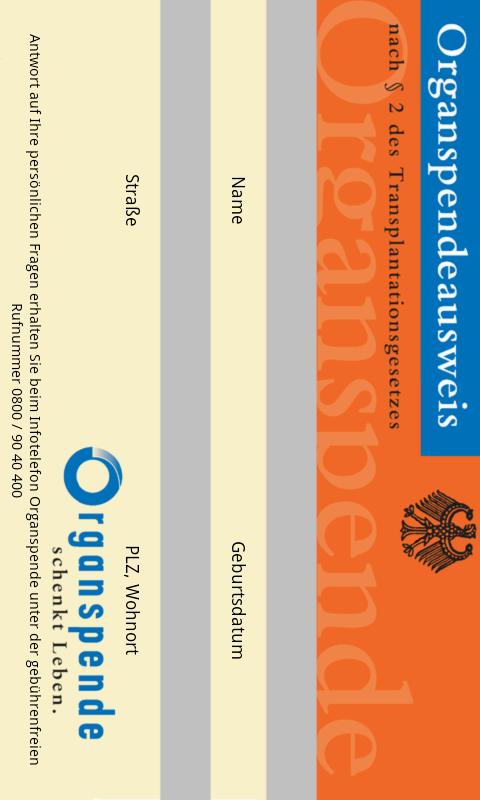 Berechtigungen dienen zur Einblendung von Werbung und zu speicherung der Nutzungsdaten (SD Karte)The donor card app is a widget for the homescreen. Please add the widget to your homescreen and show that you / no organ donor organ donor.