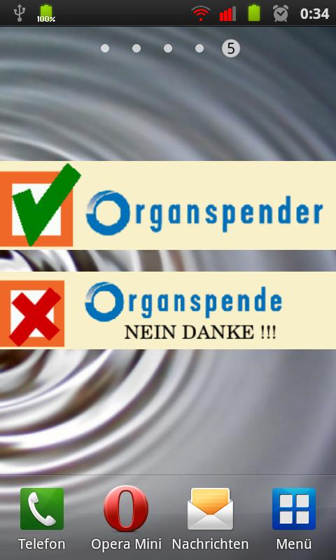 Die Organspende Ausweis App ist ein Widget für den Homescreen. Bitte fügen Sie das Widget zu Ihrem Homescreen hinzu und zeigen Sie, daß Sie Organspender / kein Organspender sind.
