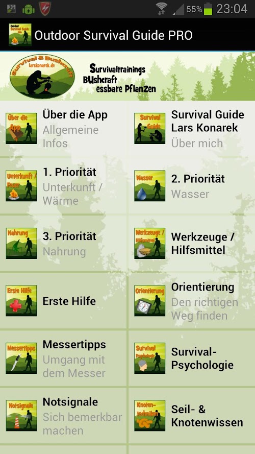 Stichworte: Survival App, Überlebenstraining, Bushcraft, Natur, Outdoor, Wildnis, Survival Guide, pflanzen, Notfall, Deutsch, Tipps, Tricks, Überleben, Guide, Sport, survivaltipps,lexikon,ratgeber,german,Kräuter,Krise,Schweiz,Swiss,Trekking,Krisenvorsorge, wandern, trekkingThe high-quality outdoor Survival and Bushcraft Guide! With essential tips for surviving in the wild. The FIRST German Survival app for your smartphone Survival professional Lars Konarek, known from radio and TV.