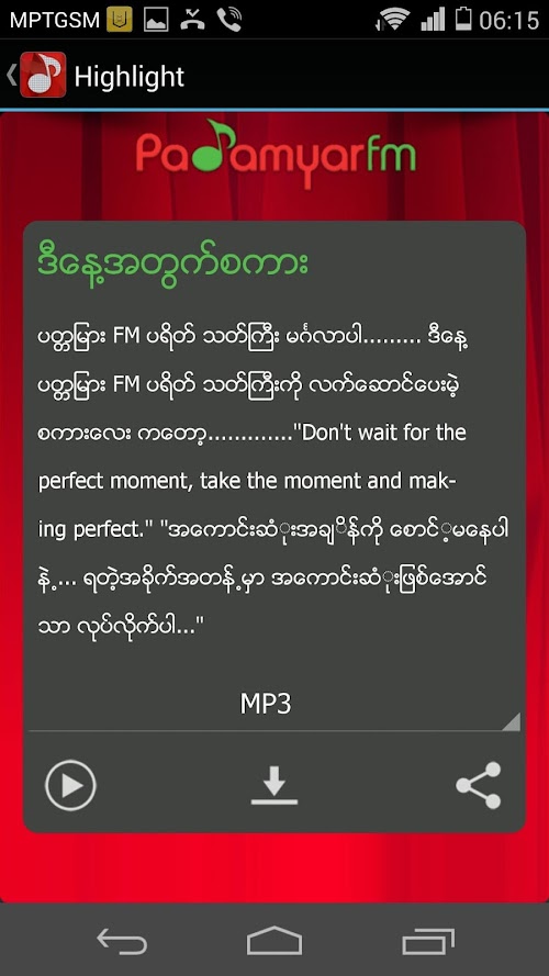 You could listen Myanmar Radio Programs by using Padamyar FM application. Beta version was already released and now Pro version is released. By using Padamyar FM application, you can -