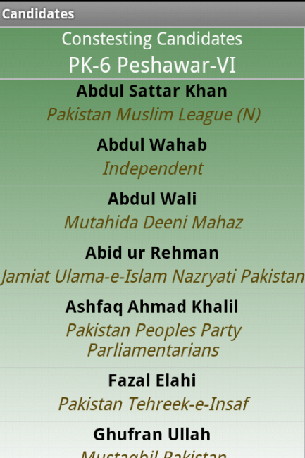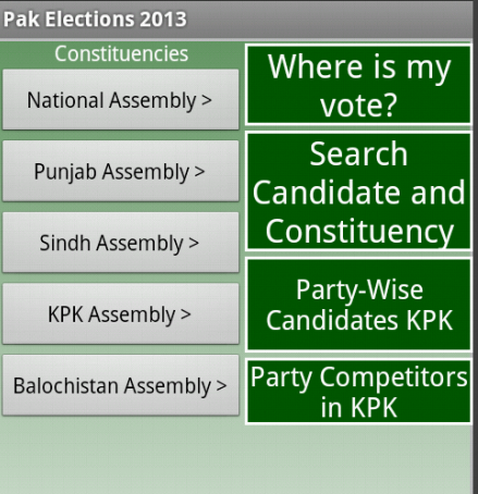 Pak Elections Diary 2013 gives information about General Elections 2013 in Pakistan. It lists all constituencies (National and Provincial) in Pakistan. When constituency is selected detail about the constituency is shown to user.The basic information about constituencies is the number of voters, number of Polling Stations, Polling Booths and name and contact phone no. of the Returning Officer.