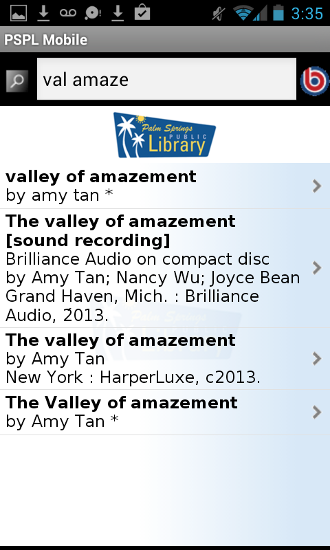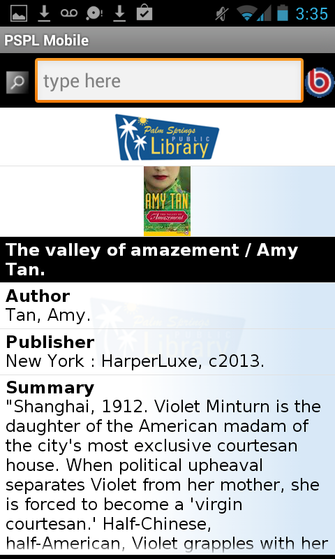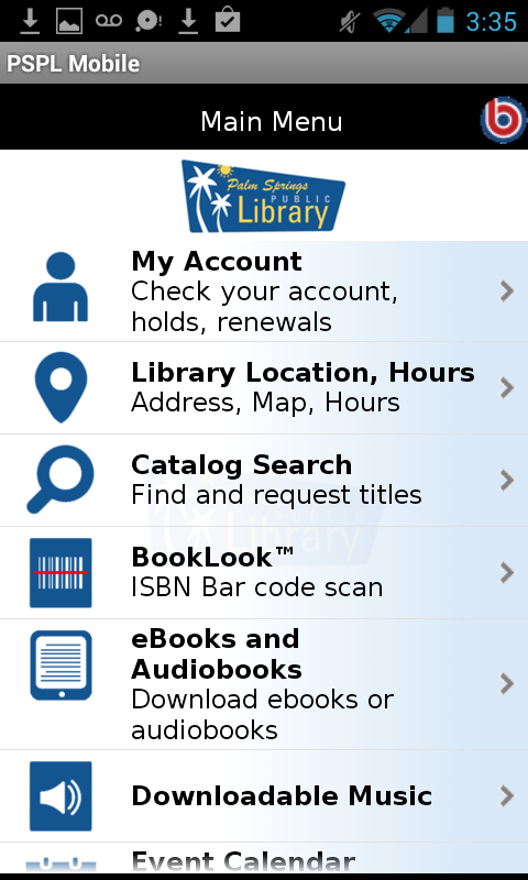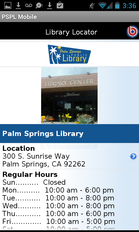 The Palm Springs Public Library (CA) mobile app gives users easy access to the Library’s catalog and their account. Place holds, renew items, or search for books, DVDs, CDs and more. Download audiobooks or ebooks through OverDrive in one step. Follow our blog and tweets or like us, there are many ways to connect to the Library. Plus, using this mobile app you can scan an ISBN barcode of any book in a store and immediately see if it is available at our library and place a hold for you! The Palm Springs Public Library is just a click away, wherever you are!