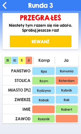 Wpisywanie słów kończy się, gdy gracz uzupełni wszystkie pola i naciśnie SPRAWDZAM lub gdy upłynie czas trwania rundy.