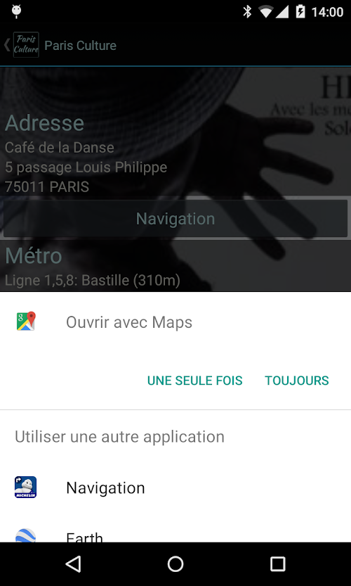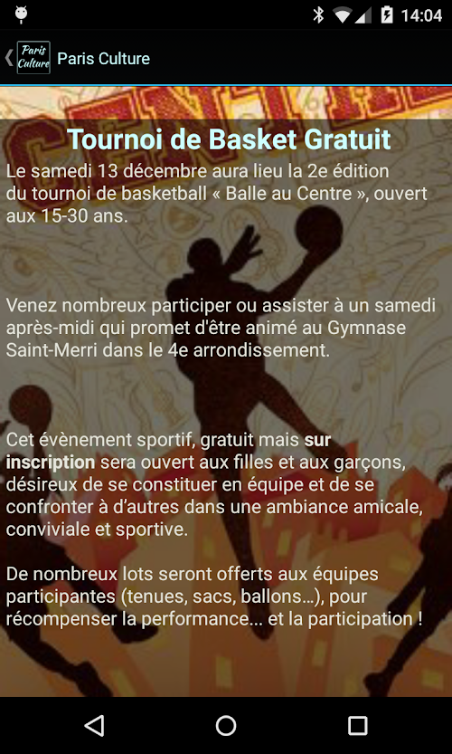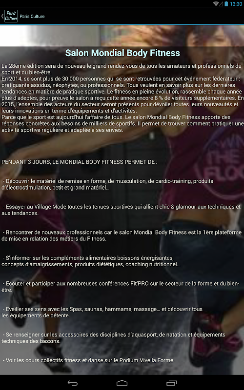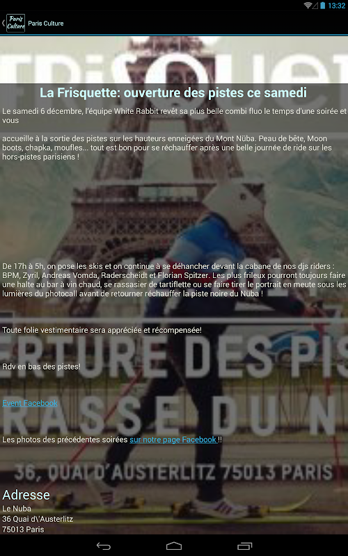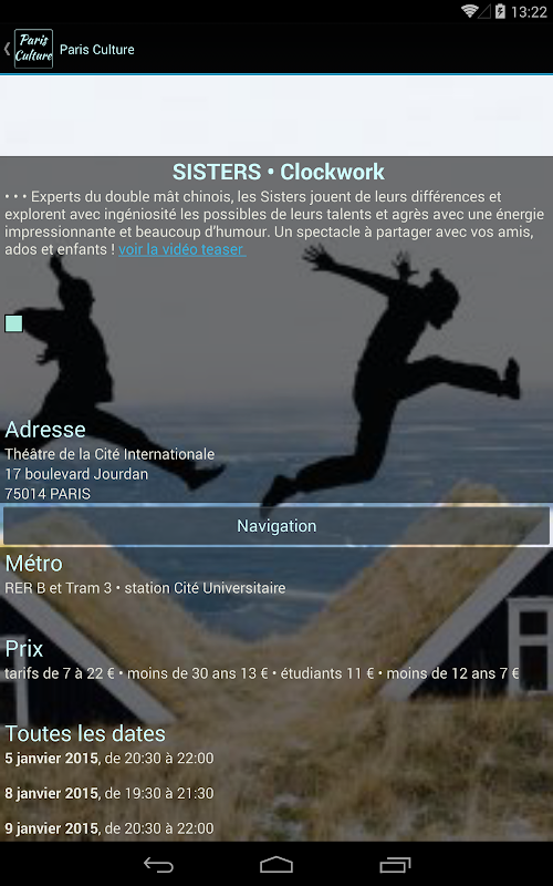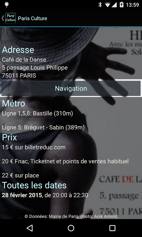 En choisissant un événement dans la riche interface de Paris Culture, vous obtiendrez les informations suivantes: