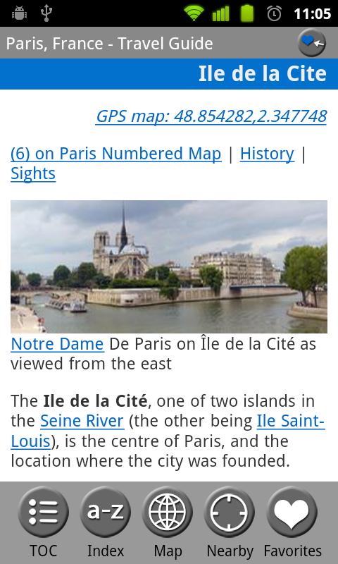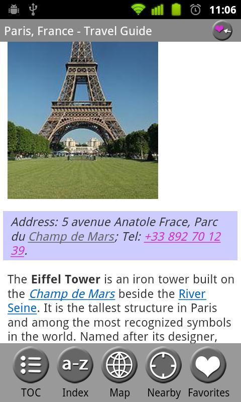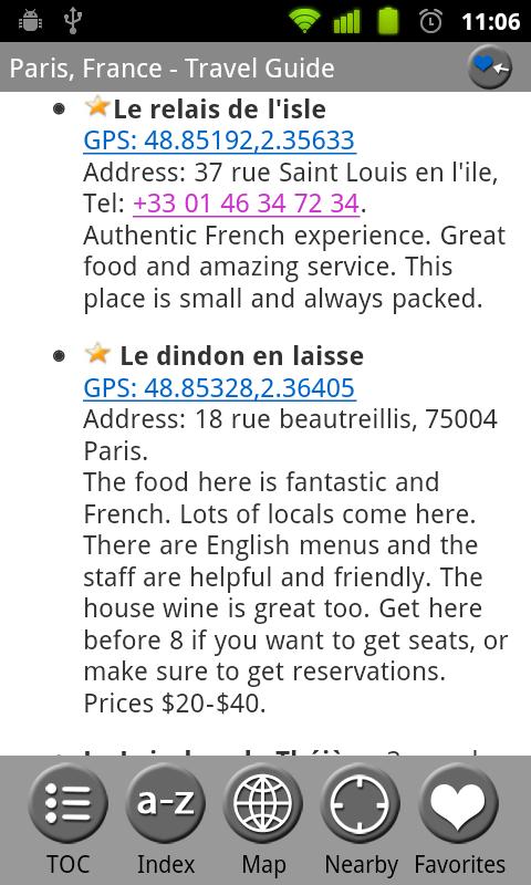 MobileReference Travel Guides provide detailed, practical information about attractions, landmarks, transportation, cultural venues, dining, lodging, history and much more. They are indexed alphabetically and by category, making it easier to access individual articles. Attractions can be viewed on an offline GPS map along with your current location so that you can easily find attractions near you as you explore the city.