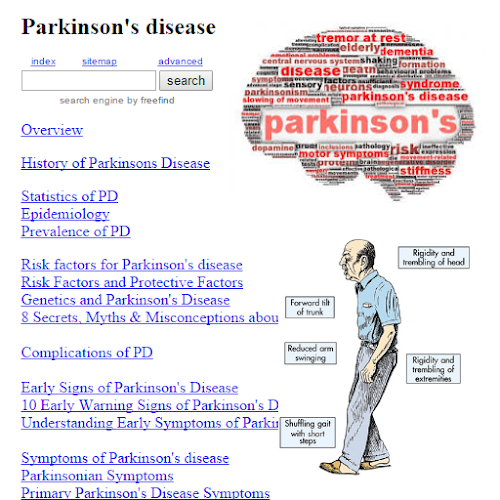 Complications, Early Signs, 10 Early Warning Signs, Symptoms of Parkinson's disease, PD, Progression, Clinical progression of Parkinson's disease, Movement Disorders Associated With PD, Clinical Features, Causes, Tests and diagnosis for Parkinson's disease, Treatments and drugs, Research, Gene therapy for PD, surgeries for Parkinson's disease, Deep brain stimulation, Rehabilitation Therapies, Long-term Complications, Lifestyle Tips to Help Manage the Symptoms of PD patients, Guide to Family Caregiver, Life Expectancy, Dietary Factors, supplements,