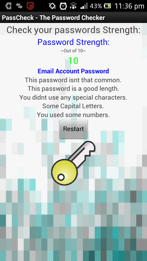 PassChecker is an app designed to allow people like you and I to check how strong our passwords really are. PassChecker uses a mix of checking methods & techniques ranging from methods that stop against hacking attacks like brute force attacks and dictionary attacks. Using these techniques allows PassChecker to make sure that your passwords are as strong as they can be.