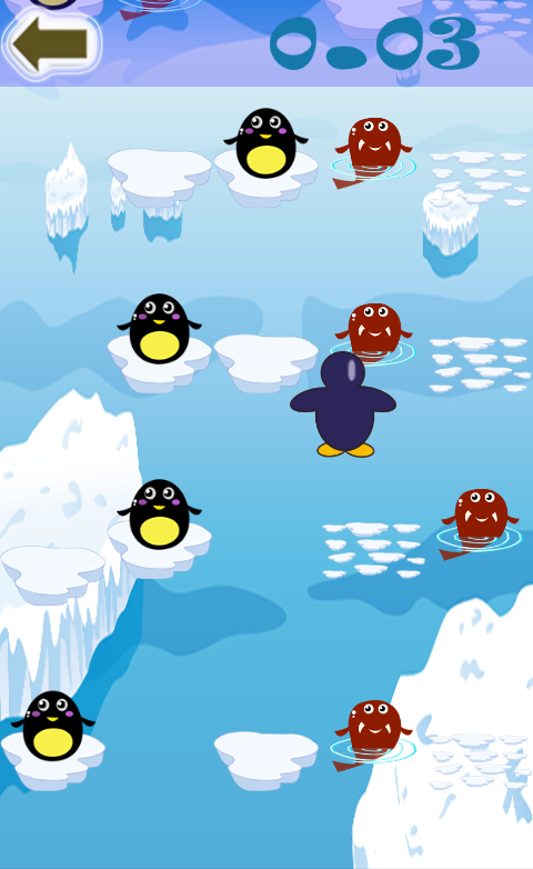 The main character in this game is the penguin. The penguin try to find the large iceberg to live on while it is on the broken iceberg. That's why it try to jump over the icebergs even when there are many dangerous. There are so many black penguin on the small iceberg.If the penguin jumps over this iceberg having the black one, it will be junk with that black penguin. Beside that there are many seal swimming on the sea. If the penguin jumps over these seal, it will be eaten huhm. Let's try to avoid theme, the black penguins and the seals. In addition, the penguin shoul not jump over the broken icebergs and the blank positions because it will be junk when jumps on them.