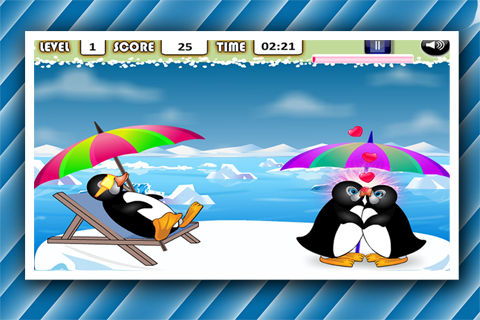 The Penguin pair wants to kiss each other, but a mother penguin and penguin chicks creating some trouble to them. Help that cute penguin pair to enjoy the romantic kiss, by touching the screen and also alert them at the right moment to avoid the game exit.