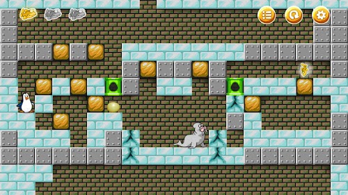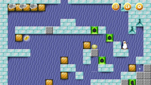 Walk and jump by pressing the virtual buttons on your iPhone or iPad. You can break a block of ice in front of you or kick down a rock by swiping down. Rocks can also be pushed.