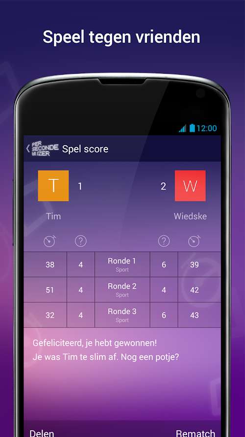 Als je tegen een ander speelt, gaat het niet om de hoogste score maar om wie als eerste twee vragen gewonnen heeft. Een vraag win je door meer antwoorden goed te hebben dan de tegenstander. Bij een gelijk aantal goede vragen wint diegene die de minste tijd nodig had. Maar: je weet natuurlijk níet hoe snel je tegenstander gespeeld heeft…