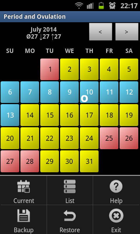 * Colors indicate the meaning of a day: Red (Days of the period), Yellow (Infertile Days), Blue (Fertile days)