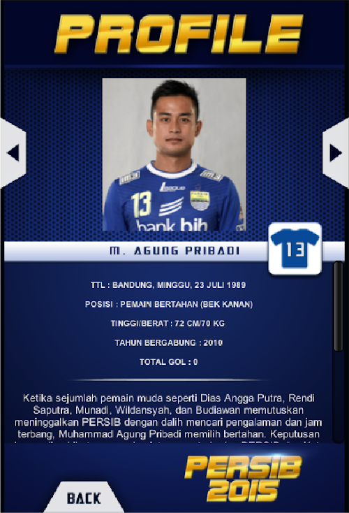 Dengan Aplikasi PERSIB 2015 ini, akan membantu setiap orang khususnya BOBOTOH untuk mengerti informasi mengenai PERSIB di musim kompetisi 2015. Yang pertama mengenai profil para pemain PERSIB di musim ini. Kenali para pemain dan pelatih, dan dukung terus klub kebangganmu ini, PERSIB.By Application PERSIB 2015, will help everyone, especially Bobotoh to understand information about PERSIB in 2015. The first season of the players profile PERSIB in this season. Get to know the players and coaches, and continue to support this kebangganmu club, PERSIB.