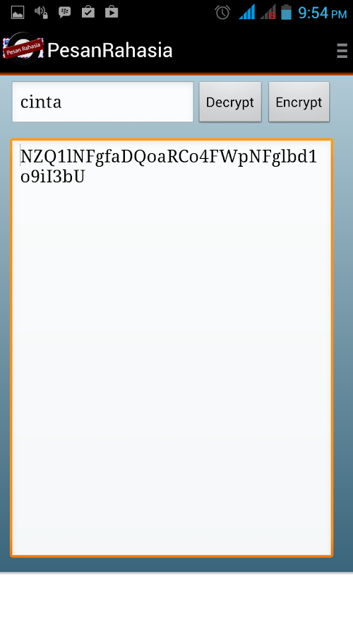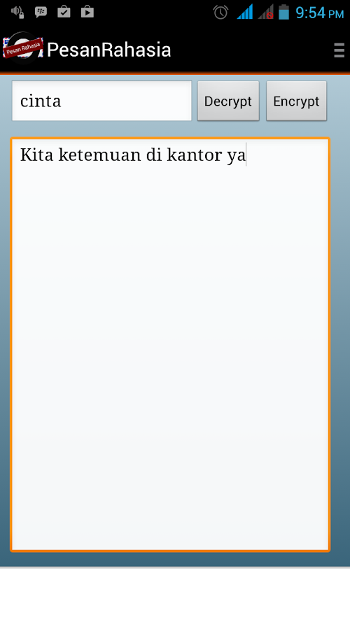 Pesan Rahasia adalah sebuah aplikasi untuk membuat sebuah pesan yang hanya bisa di baca apabila seseorang mengetahui kunci pada saat di buat pesan tersebut, pesan rahasia bisa di kirim melalui berbagai media pengirim pesan baik itu melalui SMS atau melalui aplikasi chating dan sosial media.The secret message is an application to create a message that can only be read if someone knows of a key made at the time of the message, secret message can be sent through various media sender of a message either via SMS or via chat applications and social media.