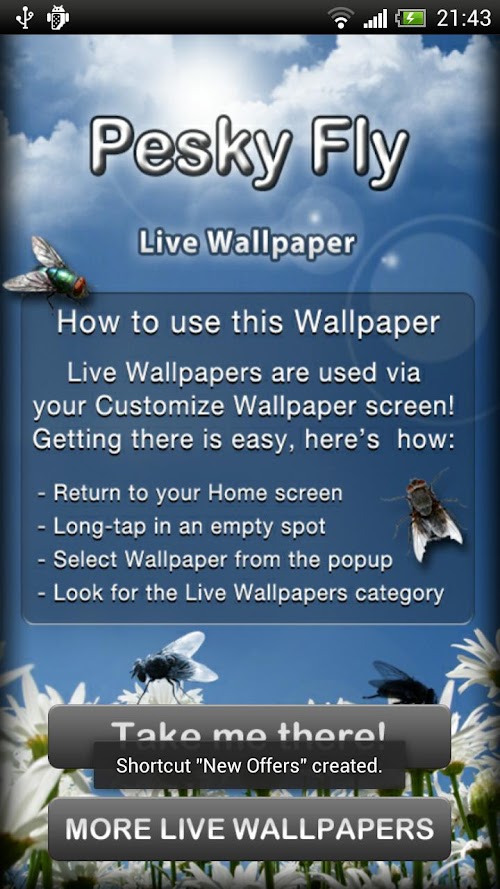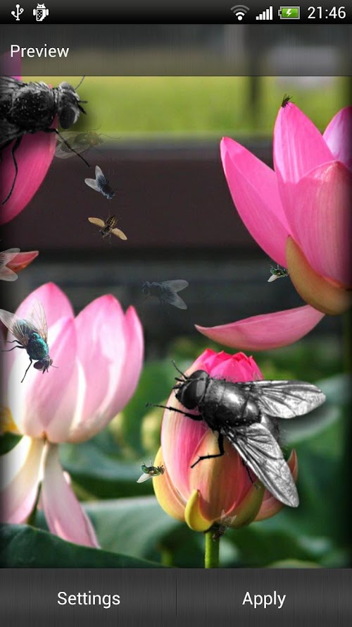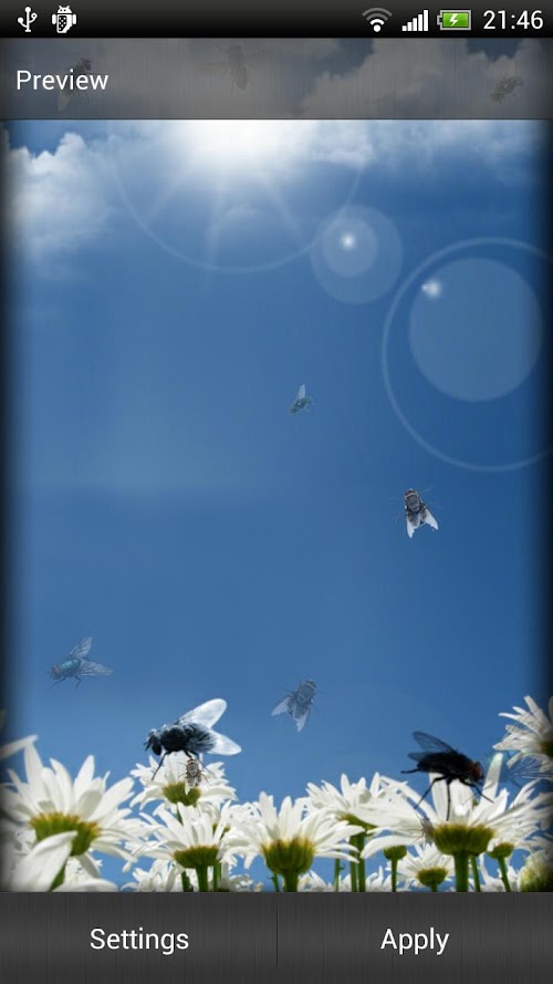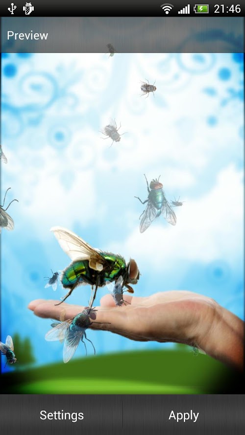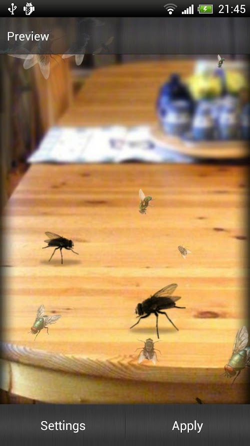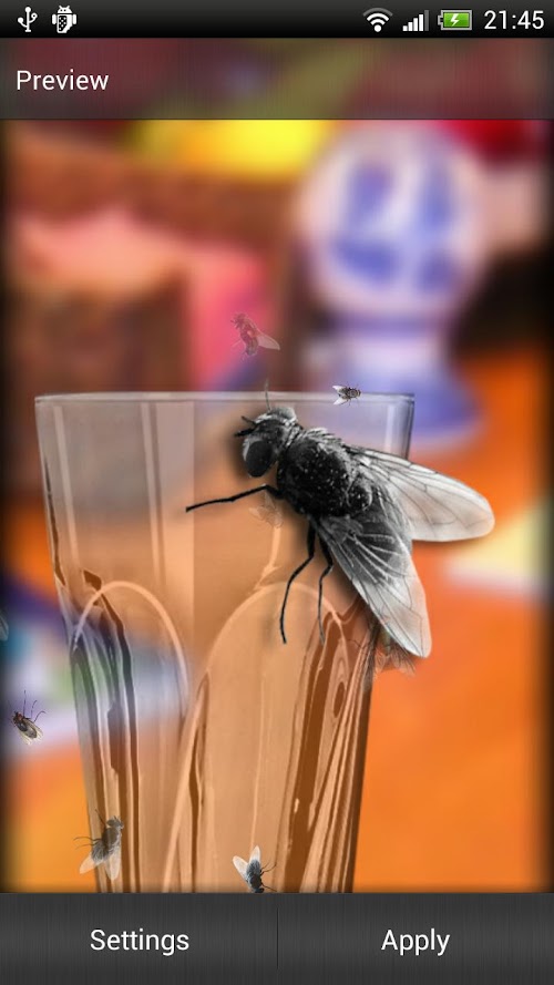 Flies are generally very annoying creatures. You might wonder why would somebody want a pesky fly on their phone screen, but precisely because flies are so annoying and people usually have an urge to chase them, it is so very interesting to have Pesky Fly Live Wallpaper! No better fun than when you trick someone and make a cool prank! This is a perfect opportunity to try out your entertaining abilities! There are over 300,000 species of flies. Most of us have dealt with the house fly. They are annoying to say the least. At least they don't bite you. The average house fly lives about 30 days. This is good to know. If they get trapped in your house, you don't have to worry about it being around for long. Flies lay up to 3,000 eggs in their lifetime of one month. Well, I guess if you're waiting for that fly in your house to die in a month, you have bigger problems in about 14 after the eggs are laid, you'll have up to 3,000 flies. Better hope it's a male that's trapped in your house! Flies only have 2 wings. Most insects have 4. Their wings beat up to 200 times per second and they stop immediately when their feet land. Also, flies don't bite or sting. They have neither teeth nor a stinger. Flies thrust a needle like spike into their victims and injects a digestive juice that breaks down the victims cell tissue. They then suck the liquid in to injest it. Very poor manners to say the least. Flies will only continue to beat their wings so long as their feet are free. As soon as the feet become stationary, they will stop flying. Truly disgusting insects. Ugly too. There is no person that has never been annoyed by a fly of some kind. So it somehow comes natural to chase them as they fly. Sometimes they are quite easy to catch, probably when they are tired or hungry. Flies will eat anything. “Fly or flies” commonly known as the most annoying of insects can also be a source of great fun. How? Download Pesky Fly Live Wallpaper and see for yourself! You can have tons of fun and laugh together with friends when they realise they've been tricked! Joke together and enjoy for free!