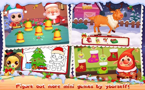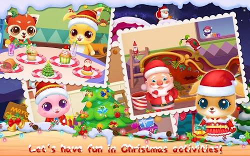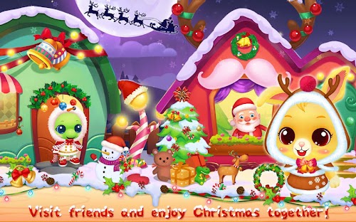 Open the game and tap your favorite animal to start. Wow~ the beautiful snow turns the street into a wonderland. And you can't take your eyes off now, huh? But sweetheart, don't linger here too long to keep your pet waiting. Let's get started by clicking the little thing's house and dressing it up. Done? Nice job! Next, slide the street, then tap any door to visit friends and play games. Whoopee~ it’s super fun to spend time with friends. Oh, but the festival really keeps our Santa and Elf busy. Dear, how about making some time to help them? Let's go!