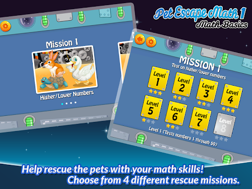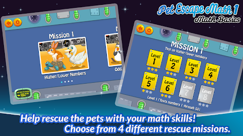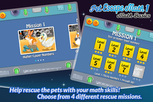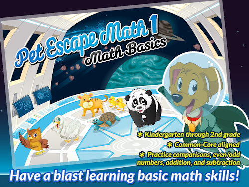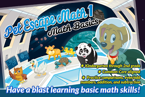 Introducing Pet Escape Math 1 - Math Basics, an app targeted towards kindergarten through second grade students. This Common Core-aligned app gives children an engaging play format while providing them with practice drills for math topics that include: greater than/less than concepts, odd/even numbers, addition problems up to number 20, and subtraction problems up to number 20.