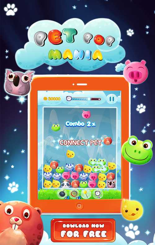 "Pet Pop Mania" was a simple game for Android, this is kind of addictive game developed based on match-3. Funny pets with many colors, different shapes free fall from the top to the bottom of the screen, sorted and clutter piling up. The game will be over if the screen was filled, so quickly overcome challenges of time to gain high points and levels. Players only need to use the basic skills as fast eyes, fast hands and one little insignificant calculations to achieve a high score in the game. "Pet Pop Mania" is suitable for all ages, all subjects play to pass the time.