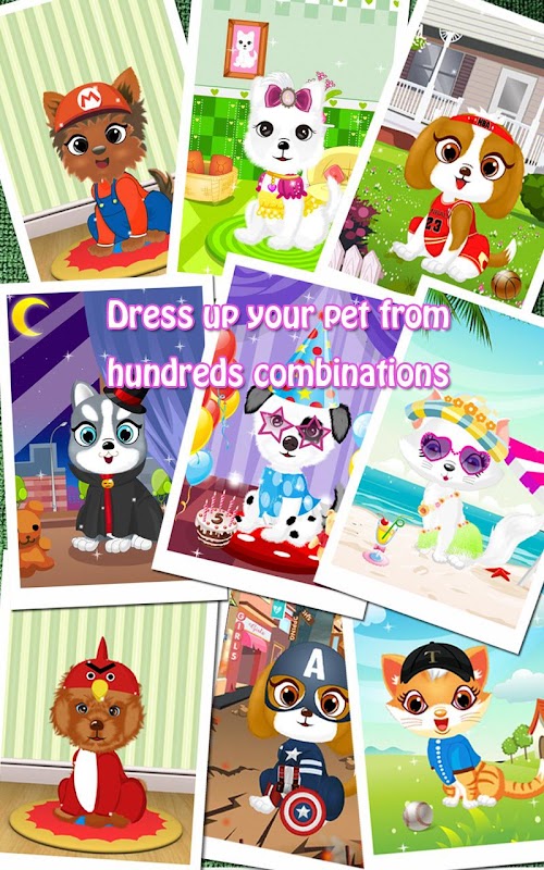 It is sure to be a game your kids will love. You get to choose it cloth, hair, necklace, hat, glasses and more. Your pet will stay in different place that you can take a picture with her. Share the photo your pet with you to your friends. Hundreds of dress up combinations will make your pet more beautiful and vivid.