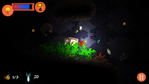 Let yourself loose into the dark and confusing dream - like atmosphere, beautiful scenery and smooth controls. (tap and drag) But this is not a no-brain adventure, tap carelessly at maximum speed and die miserable and hungry, don't look where you tap and some hungry shark or eel will have you for dinner. Understanding the environment around it is easy for those who are willing to respect the cautious rythm of the darkest ocean.