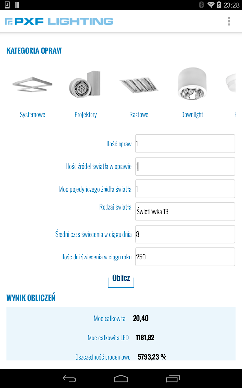 Aplikacja ma na celu w sposób prosty i przystępny umożliwić skalkulowanie oszczędności jakie można uzyskać wybierając oświetlenie używające źródeł światła LED w miejsce tradycyjnych świetlówek kompaktowych.The application is designed in a simple and accessible to allow calculating the savings that can be achieved by selecting lighting using LED light sources to replace traditional compact fluorescent lamps.