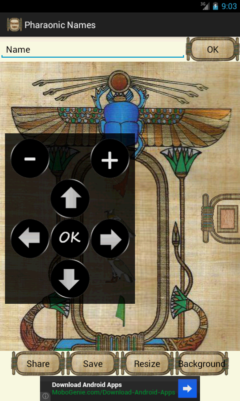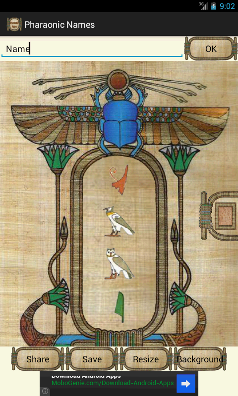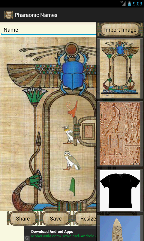 Pharaonic Names enables you to put your Pharaonic Name on Pharos images. You can also take one of your images and put your Pharaonic Name on any position of the image. The application uses the Egyptian hieroglyphs language to translate your name.