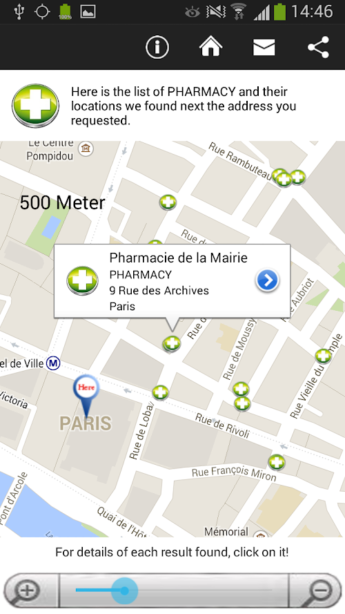 The PHARMACY application is indispensable to find the nearest location where you are pharmacy tool. No matter what country you are in, simply open PHARMACY and you can choose between seeing pharmacies around you on a map or a complete list of these pharmacies, with their addresses, phone numbers applying and the distance that separates you from them.