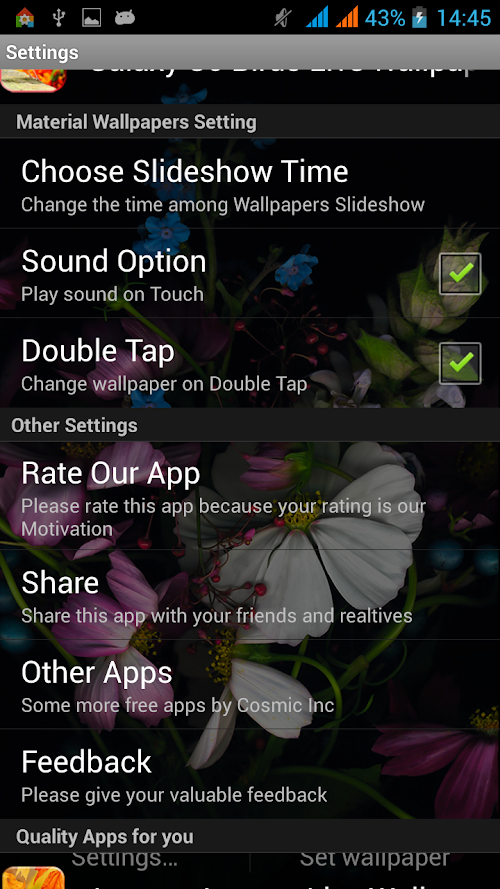 - Click on "Settings" to see the setting or select "Set wal lpaper" to activate it.