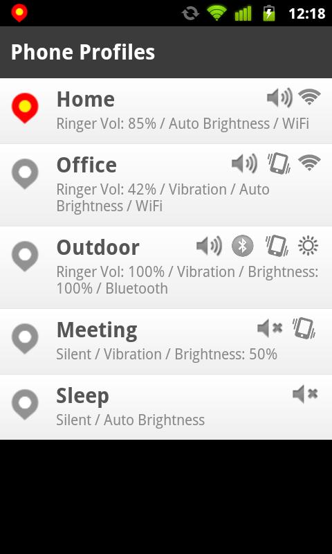 Several profiles are predefined to suit your needs. You can edit the settings if you want. In additional to manual switching of profiles, you can add time schedules for your profile, or add WiFi network to trigger profile switching. In this way, you do not need to manually switching phone profiles frequently.